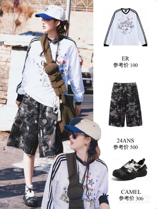 卡通印花长袖T恤充满童趣,中和了迷彩中裤的硬朗街头感;蓝白拼色棒球帽与穿搭色调呼应,橄榄绿挎包与毛绒挂饰的加入,增添了穿搭的细节感与趣味性,搭配很有巧思。这套穿搭适合户外出行、潮流打卡等场景,舒适又有辨识度。