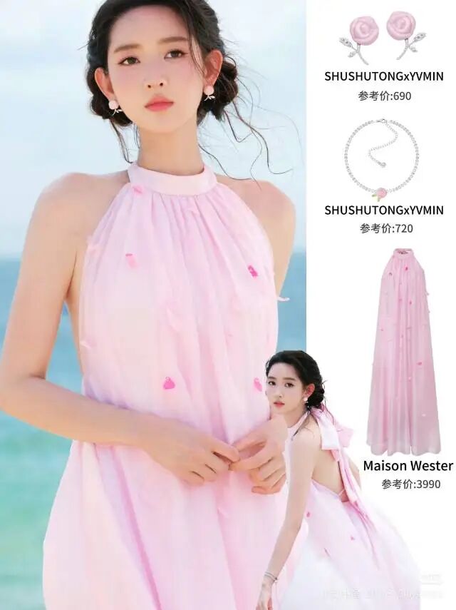 的粉色挂脖长裙,以轻纱材质和立体花瓣装饰营造出梦幻感,露背设计又注入小性感;玫瑰首饰套装,从耳环到项链都紧扣“花漾”主题,与裙装的花瓣元素呼应,将甜美精致感拉满。这套造型非常适合海岛婚礼、轻奢度假晚宴等场景,既展现出高定礼服的质感,又通过甜美元素传递出少女感。