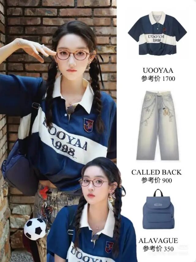 蓝白拼色的Polo衫“1998”字样和徽章元素,瞬间拉满复古学院感;搭配做旧水洗的阔腿牛仔裤,加上链条、玩偶挂饰,又有着街头潮流的随性不羁,两种风格碰撞出独特的青春活力感。双麻花辫的发型和复古圆框眼镜,细节上强化了学院风的甜酷感,既适合日常出街、校园通勤,又能在潮流打卡、休闲聚会中脱颖而出。