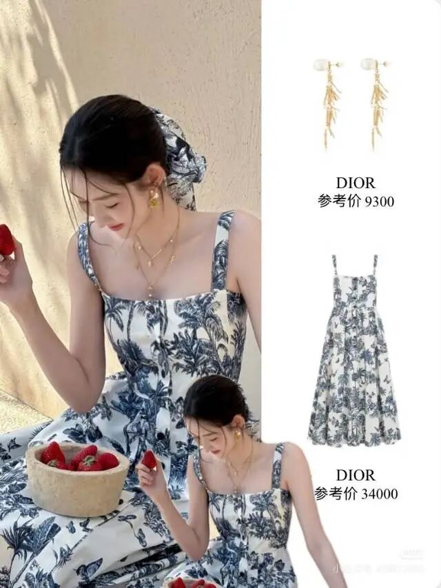 DIOR的蓝白植物印花吊带裙充满法式浪漫的度假感,方领设计复古又显气质;同系列丝巾当头饰,与裙装印花呼应,瞬间将法式风情拉满。同品牌流苏耳环与叠戴金项链与裙装的优雅调性相得益彰。这套穿搭非常适合海岛度假、轻奢下午茶等场景,既展现出高奢品牌的质感,又通过印花与丝巾的搭配营造出浪漫的度假氛围。