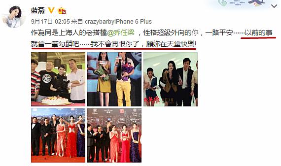 前阵子乔任梁因抑郁症去世,蓝燕也借“哀悼”之名,暗指跟乔任梁有关系。