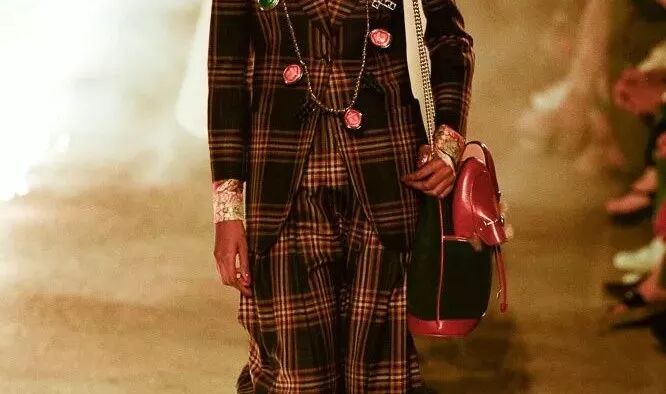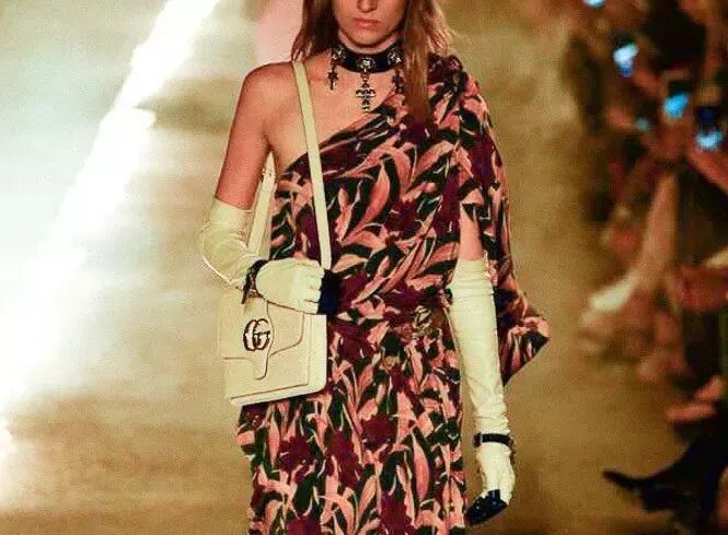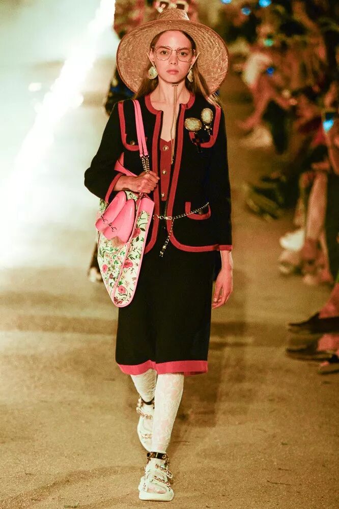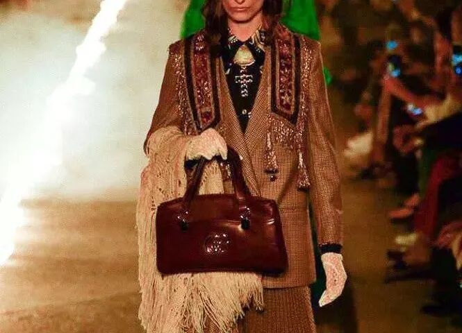 在包款中,除了有延续上一季的双G logo之外,还出现了PVC材质的Ophidia包、复古的马鞍形手提包和可以插一双穆勒鞋的大包。