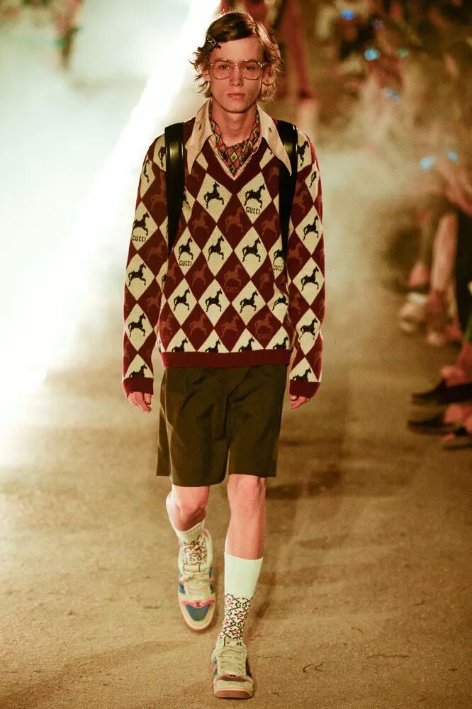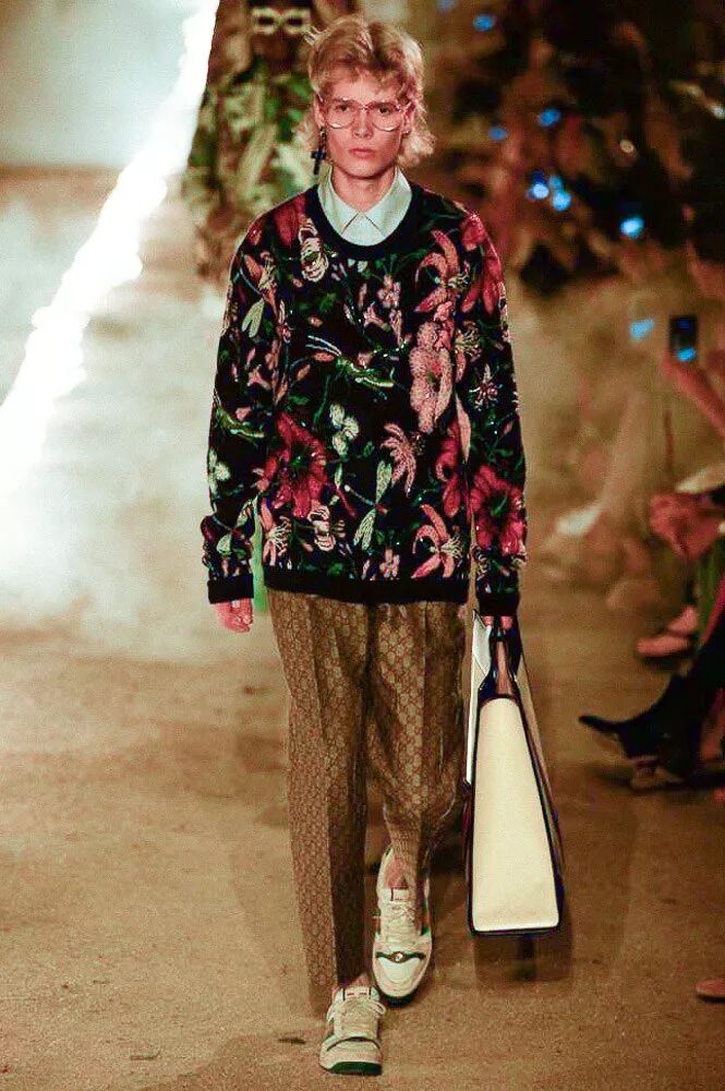 与之前一样,本季Gucci度假系列也同时发布了男装。延续了重复的Logo印花之外,还加入了不规则的大面积花朵图案,和浴袍式的外套设计。