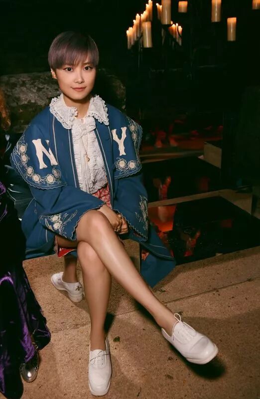 同去观秀的李宇春这次也穿了秋冬系列的洋基队披肩大衣,内搭的蕾丝衬衫和高腰短裤也是一如既往地展现了春春的好比例: