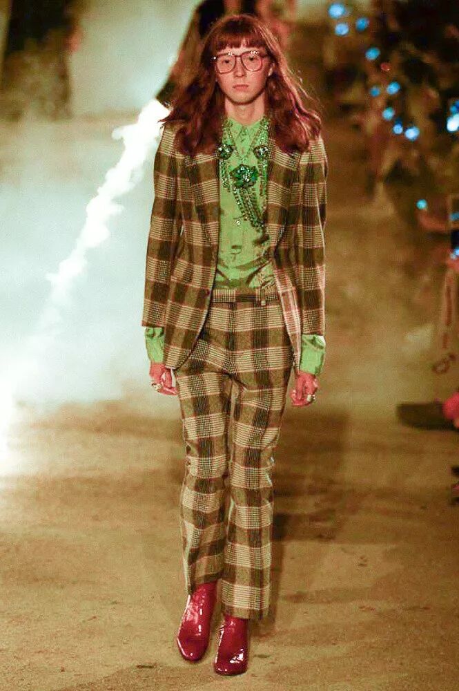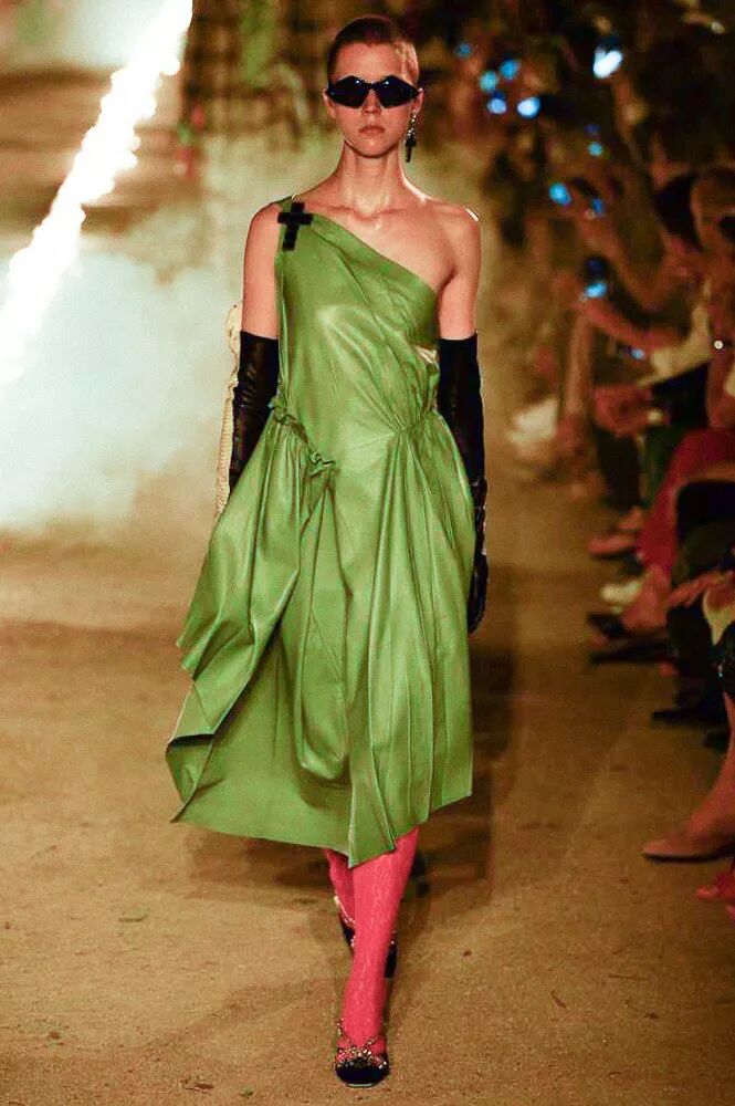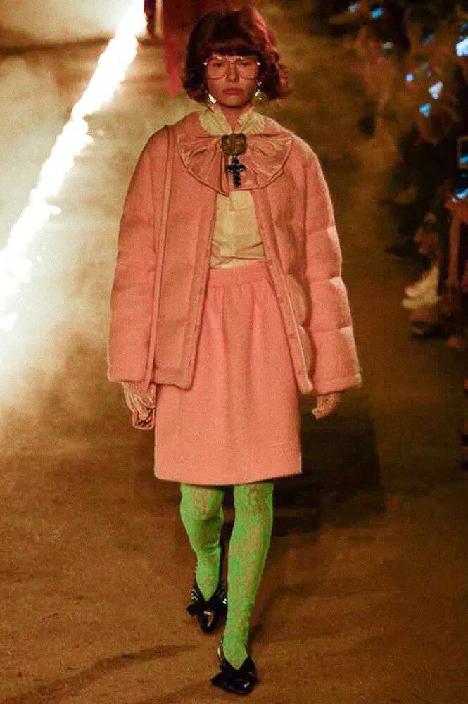 红绿色系的撞色设计,加入层次感,增加视觉冲击效果。在材质上加入了光泽感的对比,毛呢质地的外套裙装与金丝裤袜碰撞,塑料质感裙装搭配哑光的裤袜,针织套装搭配漆皮短靴。与撞色配合更凸显了设计的层次和对比。