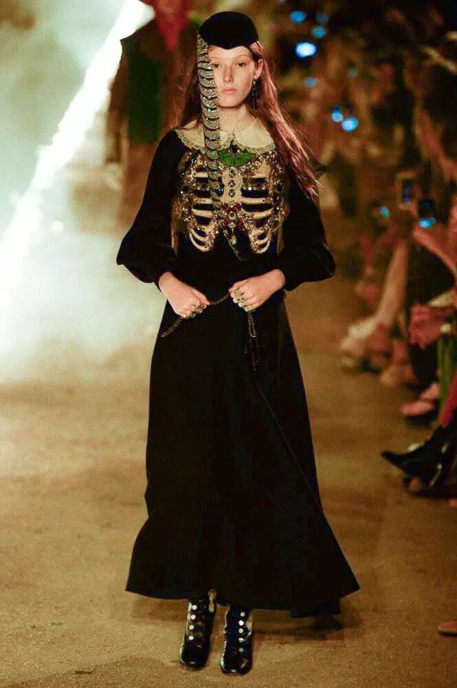 长长的花色翎羽,黑色的圆顶礼帽,骨骼骷髅的印花,透露出神秘黑暗风格。灵感来源于15世纪红衣主教和僧侣们的装饰品,想法中透露着与来世相关的一切放大化的美。