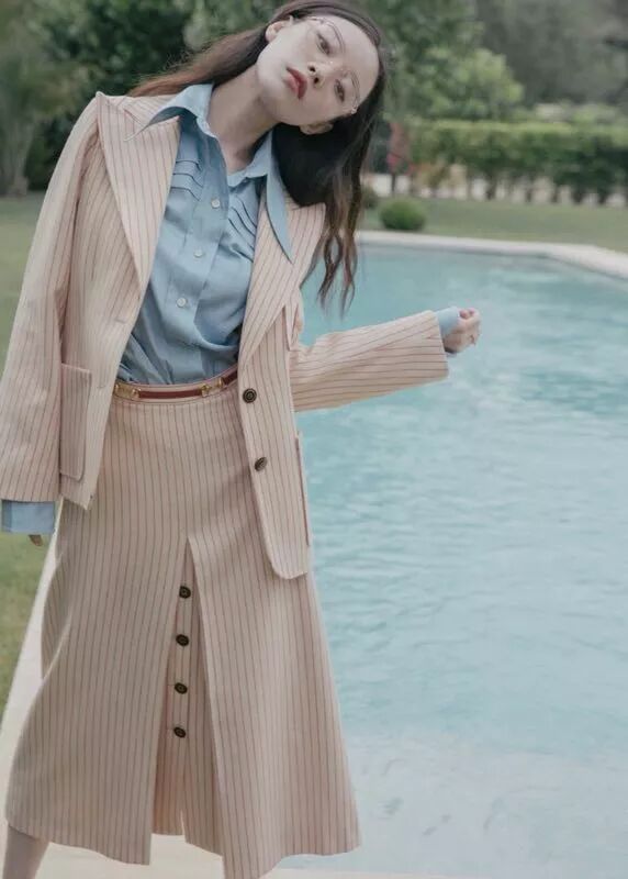 观秀时,倪妮又换了一身更具度假气氛的印花上衣搭配条纹阔腿裤。和秀前拍摄的大片风格不同,这身look相比上一套的复古少女气质,更多展现了倪妮的强气场: