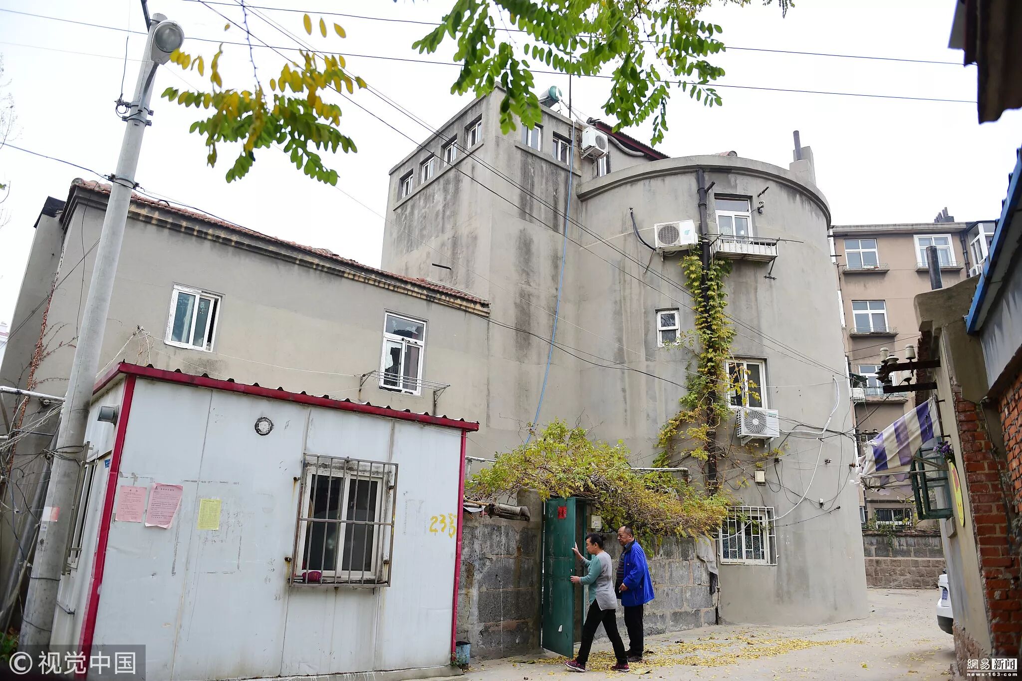 5、2017年11月17日,青岛,在山东省青岛市李沧区永安路39号,有一座圆柱形的三层小楼,建筑四周随处可见大小不一的窗户,与周围的楼房相比,这座建筑颇具特色。如果不是看到小楼的墙外装着空调外挂机,很难想像这就是一栋居民楼。说它是居民楼,其实也不准确,据了解这是一座保存完好的日军炮楼,它建成于1938年。孙从孝一家已经在此居住了55年,一开始炮楼连一块完整的玻璃都没有,后来几经改造,再后来就借着弹孔钻出了暖气管道,通上了暖气。