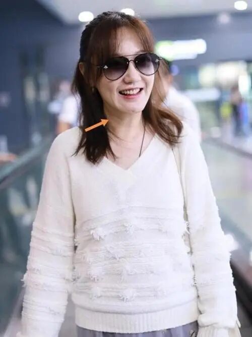 整个人因为胖了挺多的,所以感觉双下巴都是特别的明显,还有就是笑起来的时候那些皱纹全部堆积在一起的话,显得整个人的年纪当然会比较显老呀,身上穿着一件白色的毛衣,这件毛衣上面的设计也是显得比较的年轻。