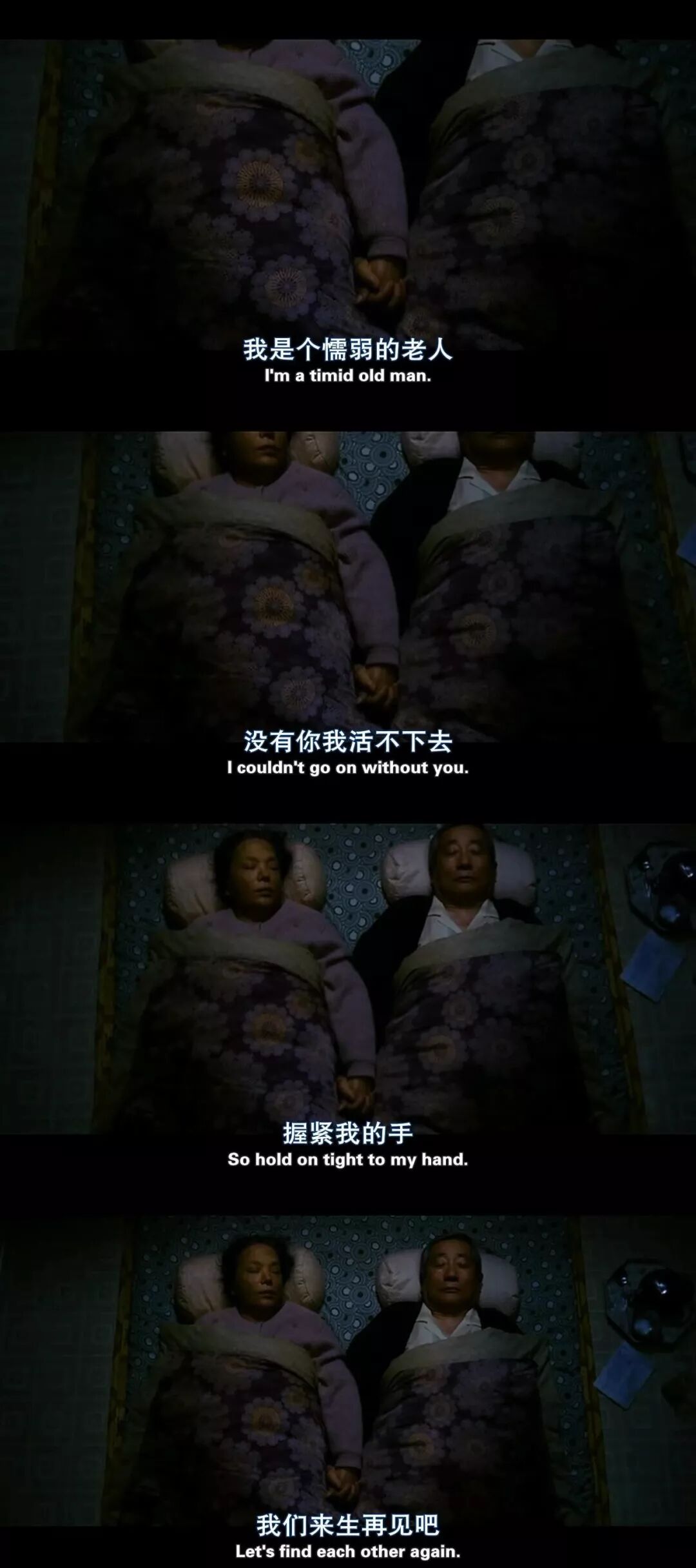 “我这人懦弱了一辈子,我真的没勇气离开你后一个人面对这个世界。年轻的时候说不求同年同月同日生,但求同年同月同日生死,你那时候又笑我,说我幼稚。