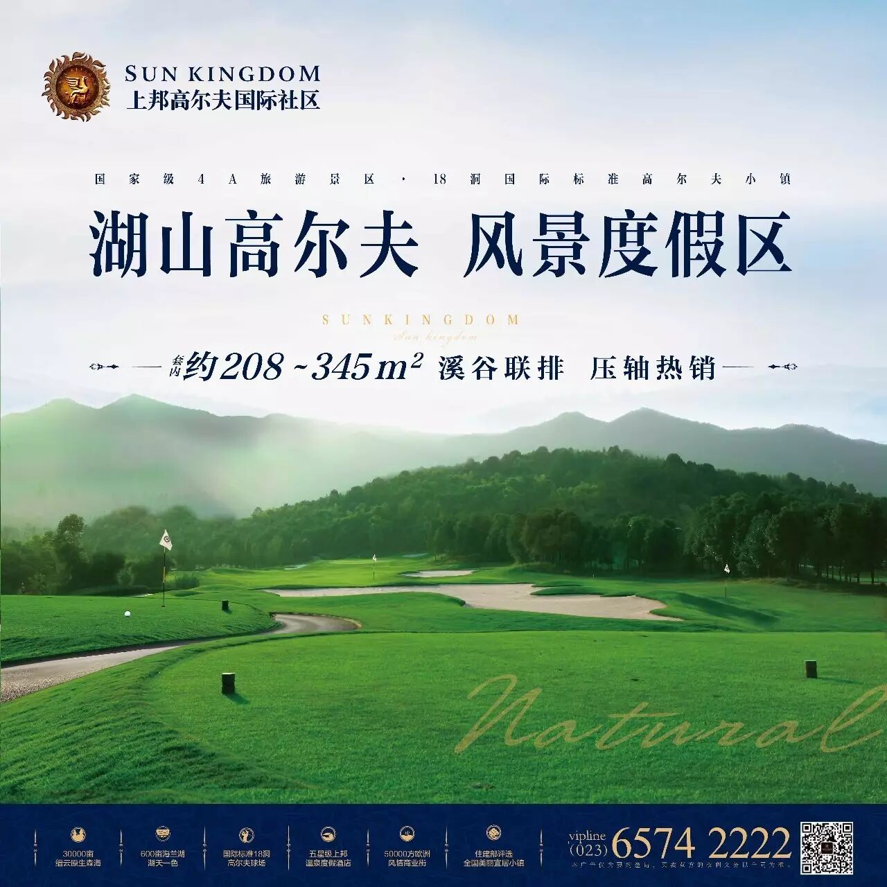上邦高尔夫AAAA级度假风景区,坐落于缙云山麓、海兰湖畔,荟萃18栋国际标准高尔夫球场、5星级度假酒店、50°源脉温泉、欧洲小镇、湿地公园、樱花大道、梧桐大道等运动、养生资源。欢迎您和家人前来休憩度假、观光游园。
