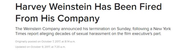 经国外媒体证实韦恩斯坦已经被自己一手创办的温斯坦影业公司解雇。
