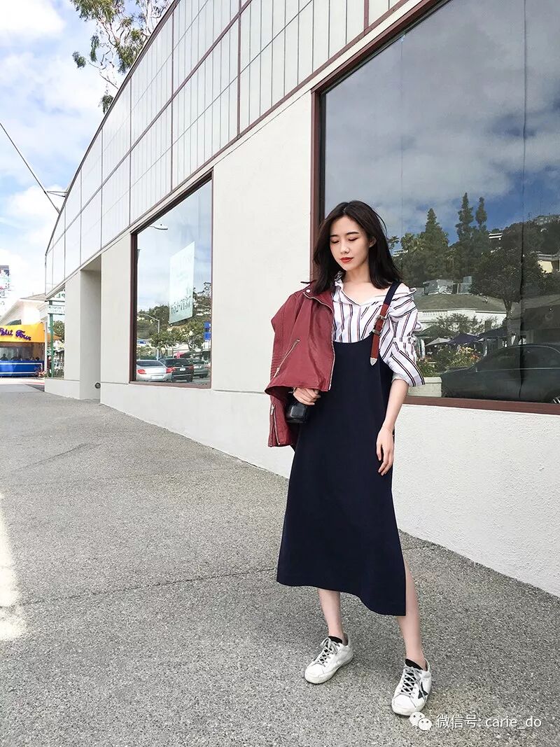 背带裙撞色的肩带更显设计感