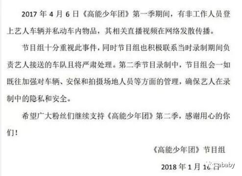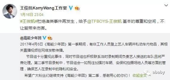 1月16日晚,高能少年团节目组发布声明,称在第一季期间有非工作人员登上艺人车辆并私动车内物品,其相关直播视频在网络发散传播。对此,节目组将加强管理,确保艺人在录制中的隐私和安全。王俊凯工作室转发表示:给予王俊凯基本的尊重和空间,不要让爱带来伤害。