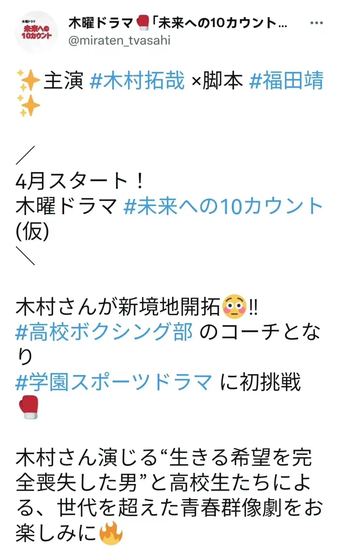 木村拓哉新剧拳击手主演,首次挑战校园体育剧 小小剧无霸 日韩男星 2022-02-07 19:47:25 1246 创作不易,用心坚持,欢迎请BaGua喝几杯爱心咖啡!打赏并支持本文 打赏并删除本文 演员木村拓哉近日确定将会主演4月开始放送的朝日电视台电视剧《迈向未来的10 Count》(暂定名),福田靖将担任脚本,这也是木村拓哉与福田靖自《HERO》系列(2001~2015年)和《CHANGE》系列(2008年)以来时隔7年再度合作。该剧作为木村拓哉首次出演的校园体育剧,邀请了众多豪华卡司,参演嘉宾也将在后续陆续公布。木村拓哉将在剧中饰演高中时代曾连续获得4座拳击冠军奖杯的天才拳手桐泽祥吾,在大学时代因为某些原因被迫放弃了拳击,告别了拳击曾带来的辉煌时刻。而之后,他心爱的妻子早逝更是让他一蹶不振失去了活下去的动力。浑浑噩噩过日子的他在亲友和恩师的不断开导下决定重回母校,在时隔近30年后成为了高中母校的一名拳击部教练,他也在这里逐渐重拾热情......该剧将于4月开始每周四晚9点进行放送。 创作不易,用心坚持,欢迎请BaGua喝几杯爱心咖啡!打赏并支持本文 打赏并删除本文 感谢您的支持鼓励,我会继续努力的!文章地址:用户邮箱:打赏金额:USDT 请输入数字点击”去打赏“,即可进行打赏支持本文章哦 木村拓哉 About the Author 小小剧无霸 功能介绍:为你带来最新最热的日剧资讯,欢迎爱追新番的盆友们关注哦 Related Posts 施瓦辛格“打”回荧屏,“蛋蛋”差点不保 2023-03-04 20:00:55 木村拓哉首部海外剧《种群》:预言下一场全球疫情? 2023-02-16 18:17:02 井上真央《花样男子》16年后再主演奇幻爱情剧 2022-12-31 18:10:06 中谷美纪女儿被害,凶手仅12岁 2022-12-11 20:46:04 《与神同行》河正宇在南美小国“扛上”贩毒集团 2022-08-22 15:00:47 发表评论
