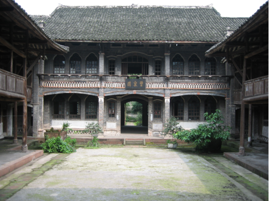 由正厅大楼、后院戏楼、左右厢楼组成大四合院。正厅大楼为单檐歇山内三层建筑,四面通廊,走马转角与厢楼相连。梁架为抬梁、穿斗混合结构,四面廊柱砖包,其余柱、梁、额均以木板包成方形并施彩绘仿青砖纹样,窗棂仿西式天主教堂式样而内嵌中式窗花。后院戏楼为单檐歇山顶,通过走马转角廊与两厢连通,形成完整的四合院格局。