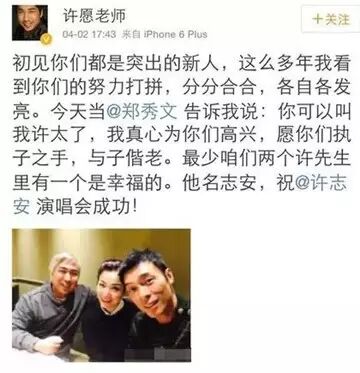 香港造型师许愿系微博曝光咗郑秀文同许志安既合照,郑秀文话:可以叫我许太。