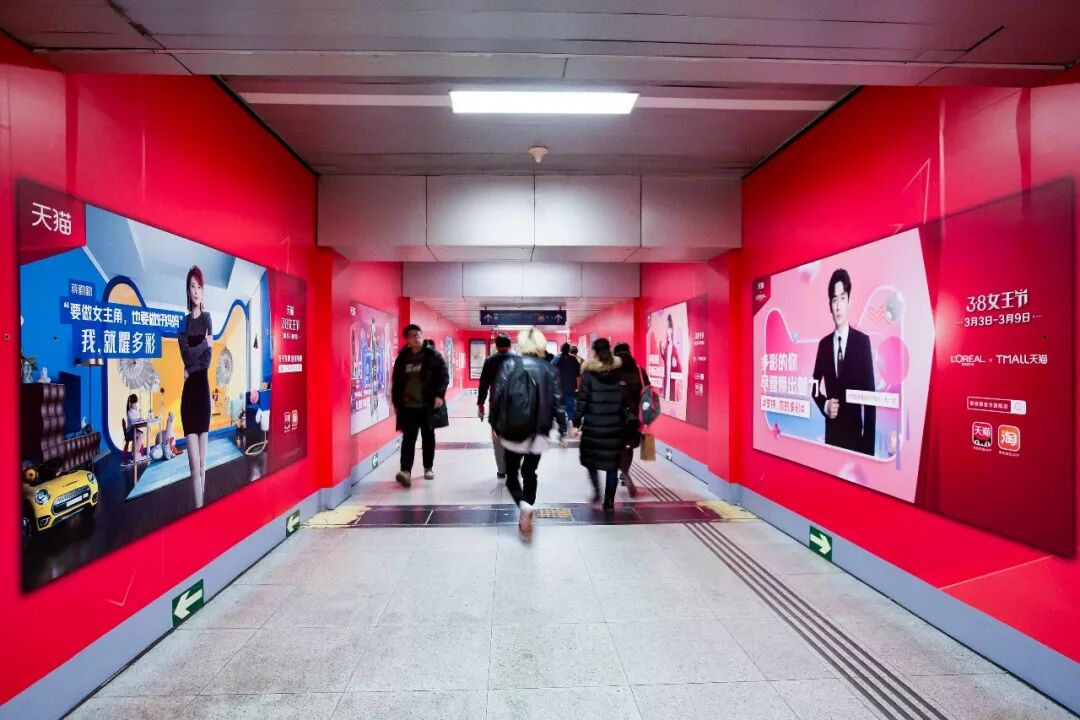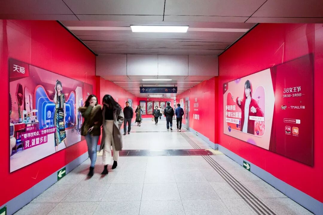 在北京大望路、上海人民广场、广州珠江新城三地的地铁站过道中,你会看到女性的多彩宣言与男性的声援支持左右相对,形成一种对话感,营造出更为浓厚的节日氛围。
