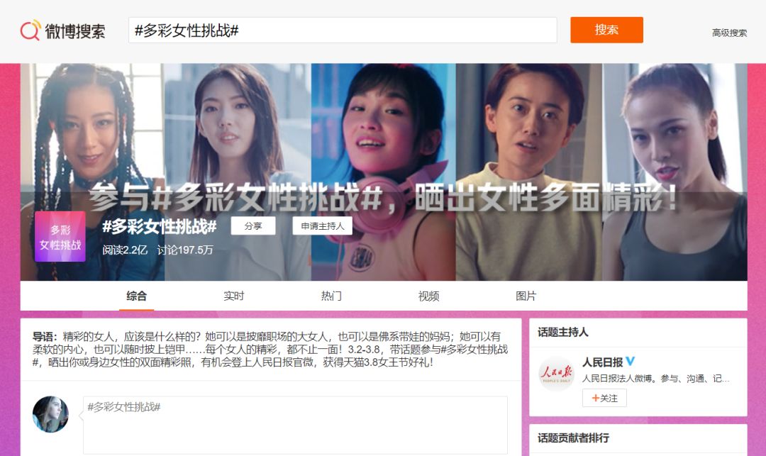 今年3.8女王节,天猫还在微博上邀请所有人一起以晒双面精彩照的方式,晒出女性的多面精彩,参与人民日报发起的#多彩女性挑战#的社交话题,以此重磅开启3.8女王节。