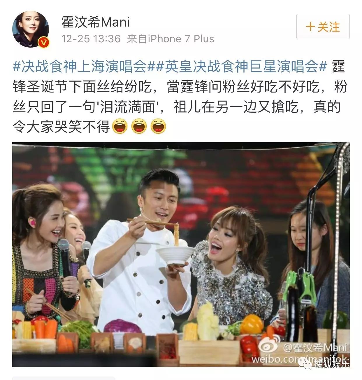 12月25日,谢霆锋经纪人霍汶希发微博晒出霆锋煮面的照片,发文称:“霆锋圣诞节下面丝给纷吃,当霆锋问粉丝好吃不好吃,粉丝只回了一句‘泪流满面’,祖儿在另一边又抢吃,真的令大家哭笑不得。”