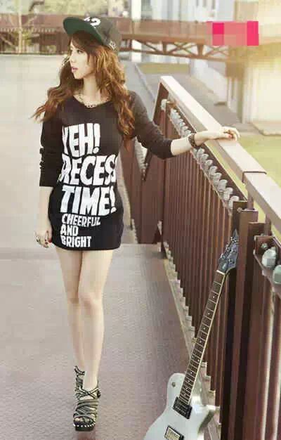 黑色长款T恤绝对是两穿单品,可以搭配丝袜穿,也可以直接当做连衣裙。简单的字母logo凸显欧美风格,搭配绑带凉鞋,潮女look。