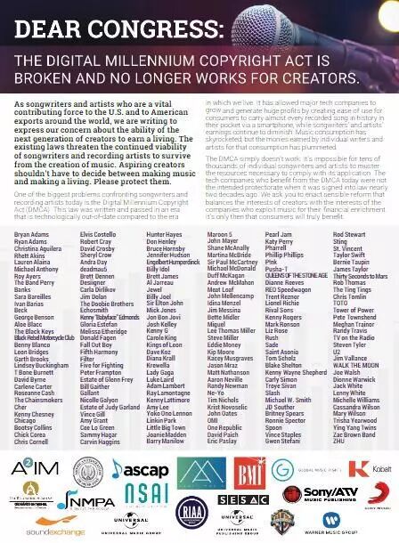 DMCA已经不再带来帮助。数万词曲作者和艺人已经不可能获得必要的资源,以配合DMCA的实施。与近20年前这项法律通过时不同,今天,从DMCA中受益的科技公司已不再是需要保护的对象。我们希望你们能采取合理的改革措施,平衡创作者的利益,以及利用音乐获得经济回报的公司的利益。只有这样,用户才能真正受益。
