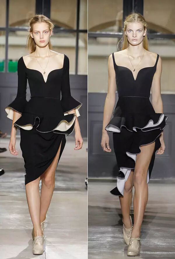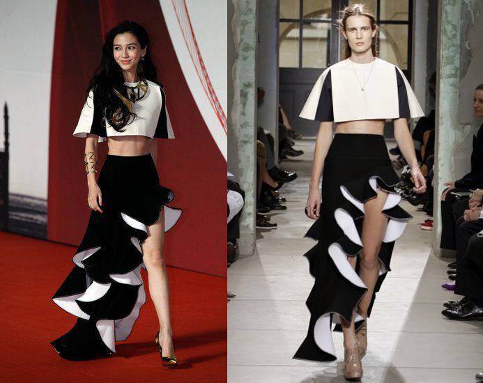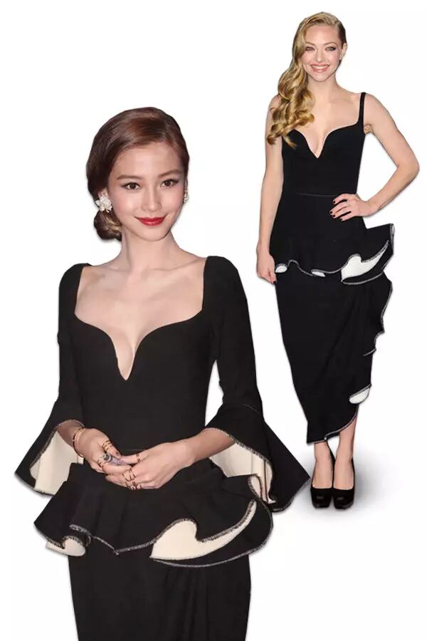巴黎世家 (Balenciaga) 2013春夏女装秀场上的这件黑白配色立体荷叶边装饰裙,也成为AngelaBaby和性感甜妞阿曼达·谢弗雷德 (Amanda Seyfried)的撞衫之作。