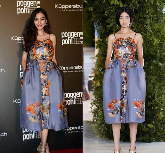 再来正面看一下,AngelaBaby这条荷叶裙配上红唇盘发,少女系的Baby变成了美艳的轻熟女,只是这双超厚防水台的露趾高跟鞋看起来太过厚重。