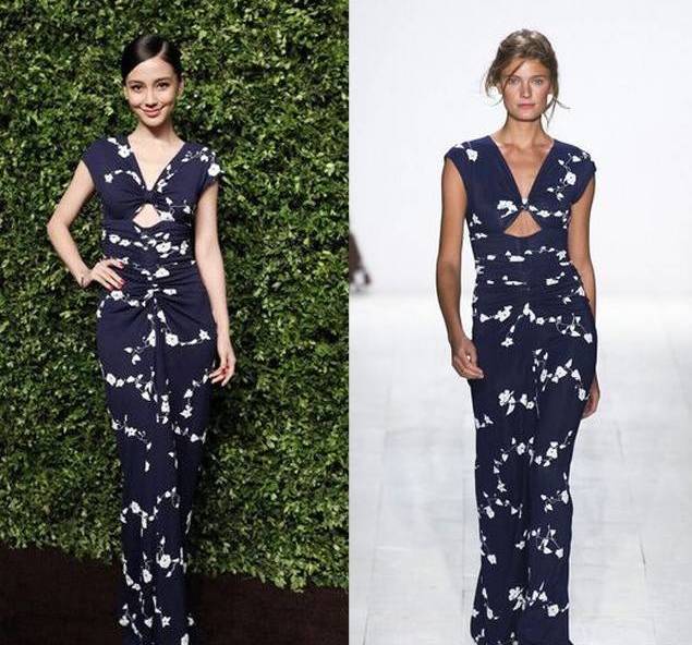 Michael Kors 2014春夏印花礼服,蓝底白色印花长裙将她的魔鬼身材展现的淋漓尽致,胸前的镂空设计,小清新风格中暗藏性感心计。