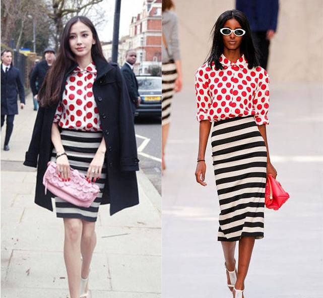 Burberry Prorsum时装亮相伦敦2014秋冬时装周,波点衫搭配黑白条纹裙,时尚元素大撞衫,大胆时髦。