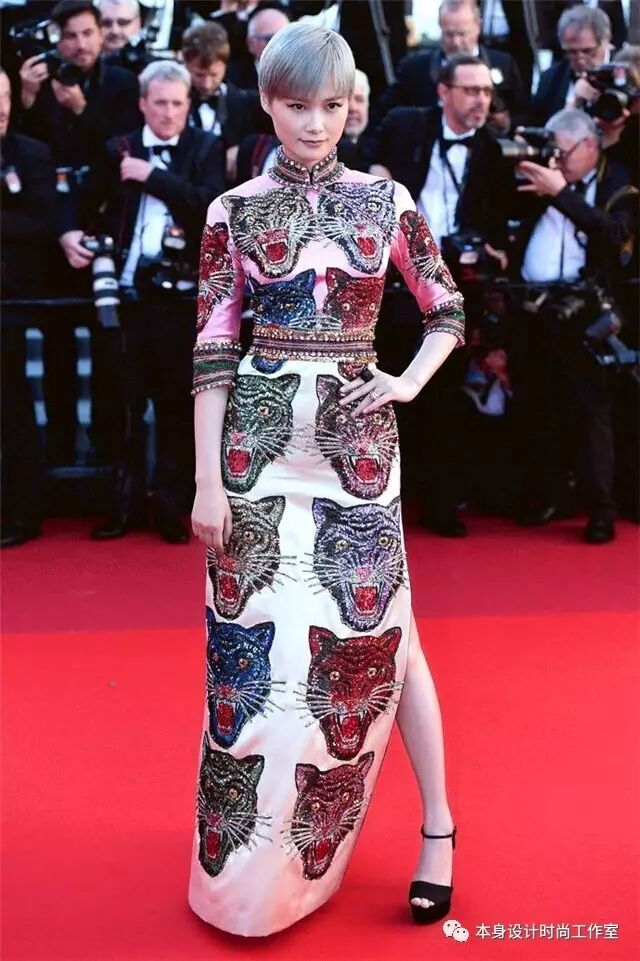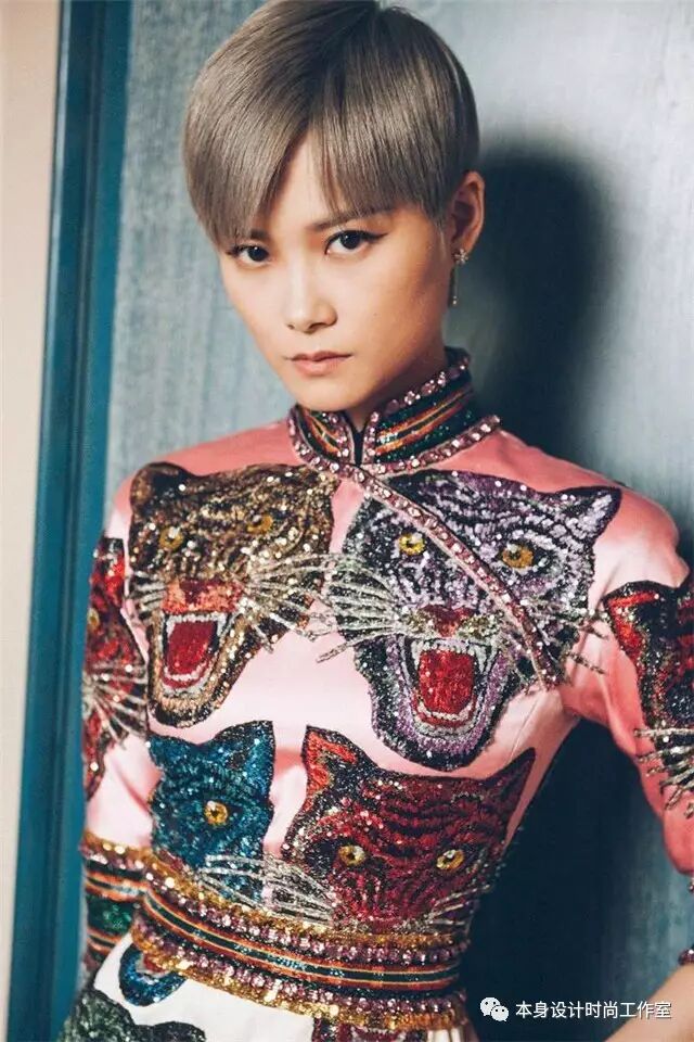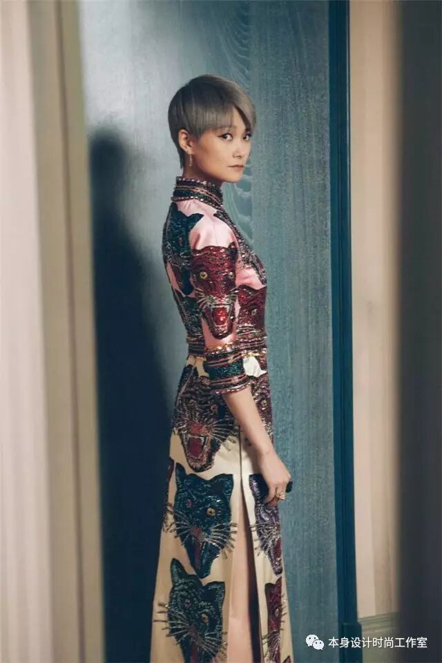 这是出自 GUCCI 设计师Alessandro Michele 为她特别定制的粉色及白色旗袍式拼接长裙,领口及袖口处缀满了彩色珍珠,“愤怒大猫”的刺绣华贵复古,极具张力。