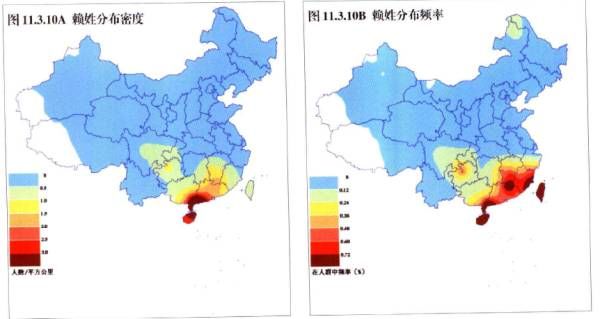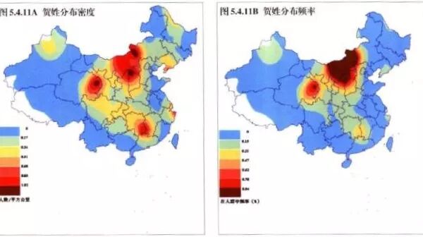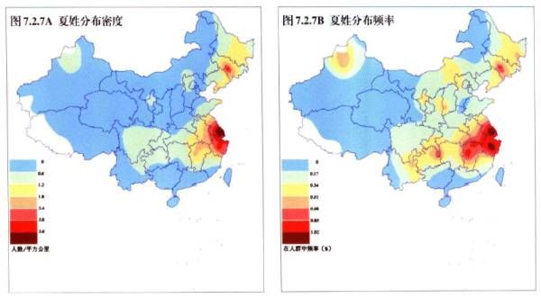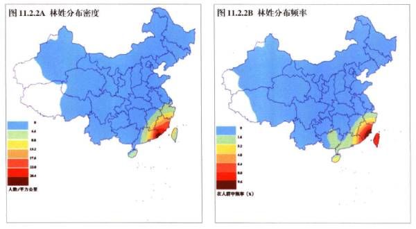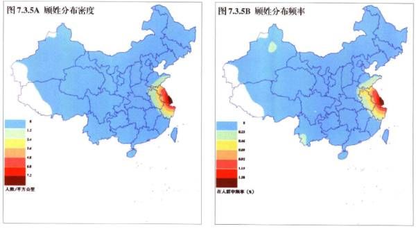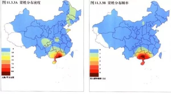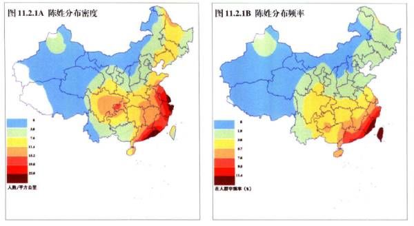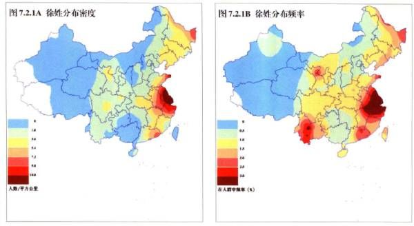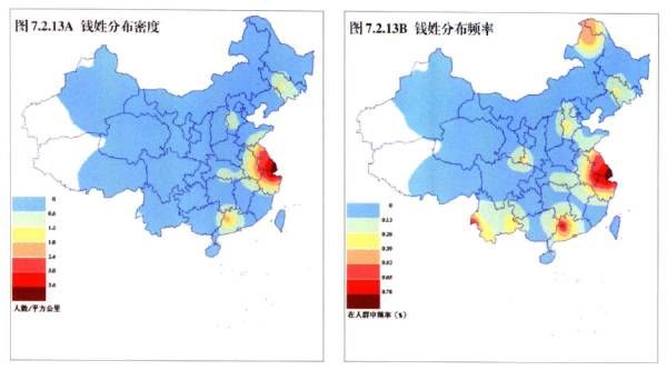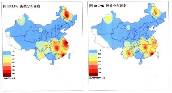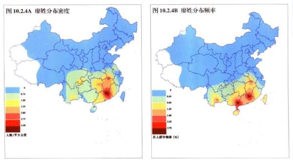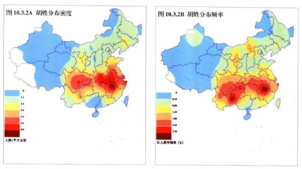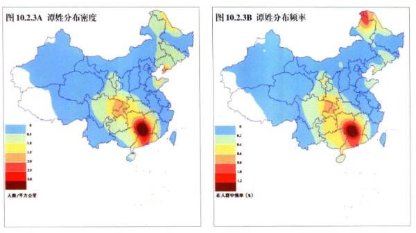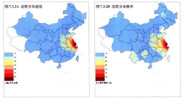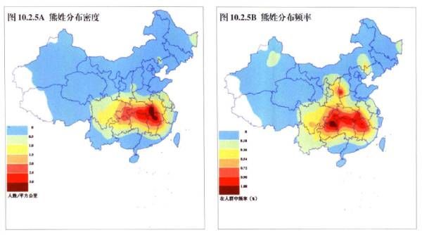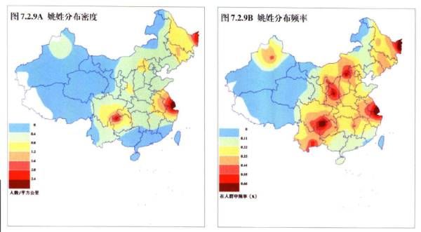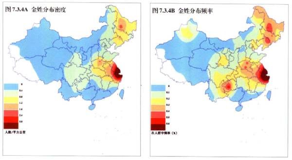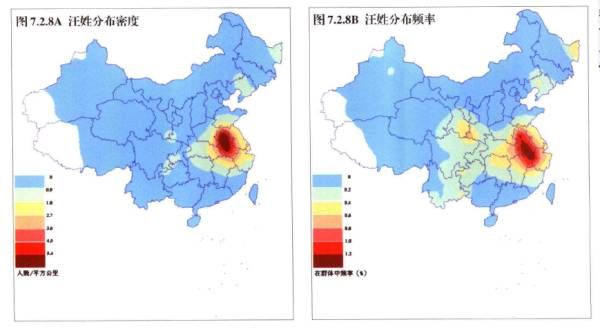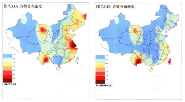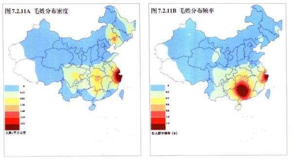 左为某姓氏的分布密度,是指单位面积上有多少某姓人口数量;
