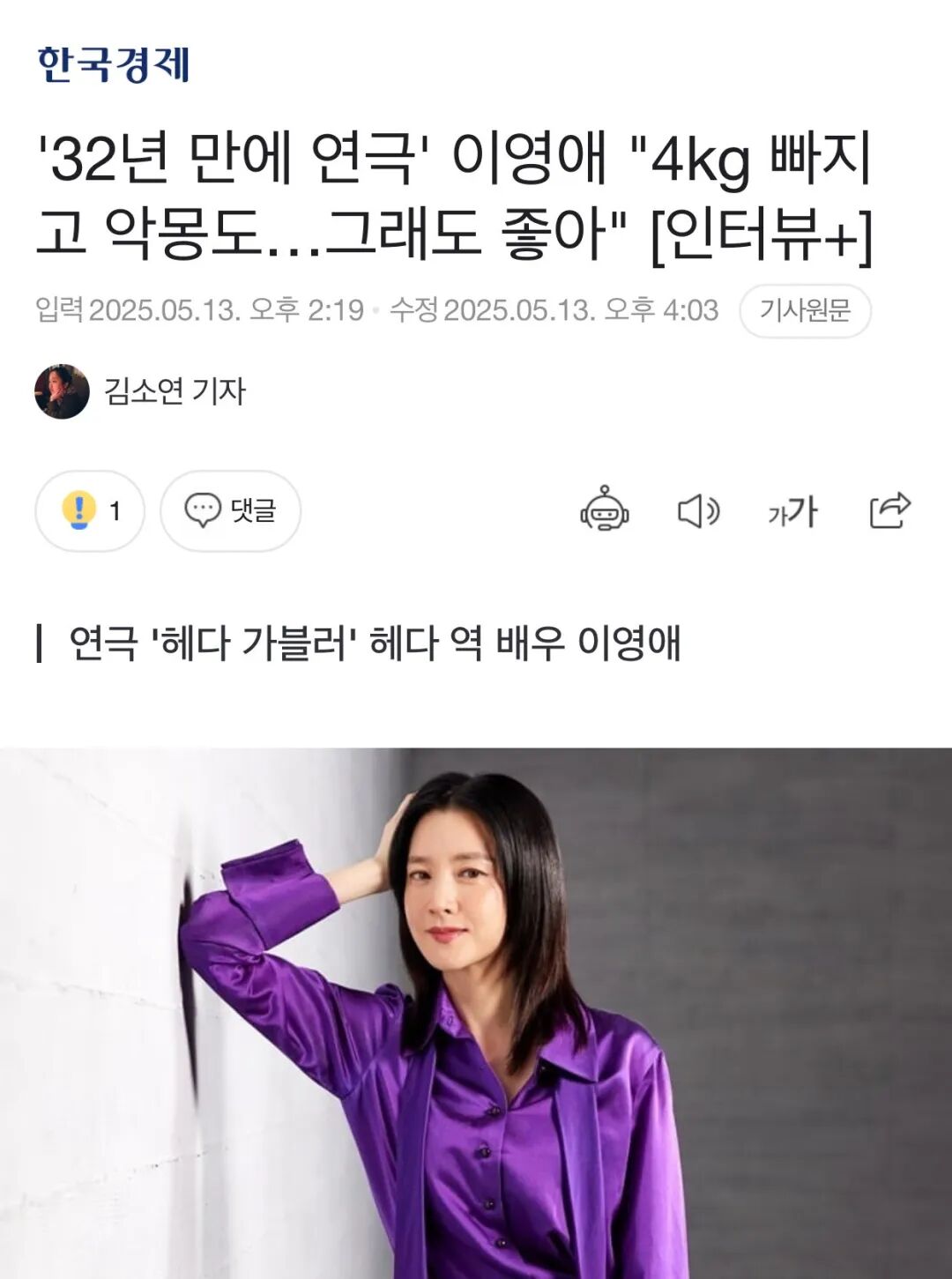 13日,李英爱在首尔江西区LG艺术中心接受了关于话剧《海达·高布乐》的采访,此次出演话剧是她时隔32年重返话剧舞台,对于首演后如潮的好评,她谦虚地笑着说:“看来大家对我没什么期待啊”。