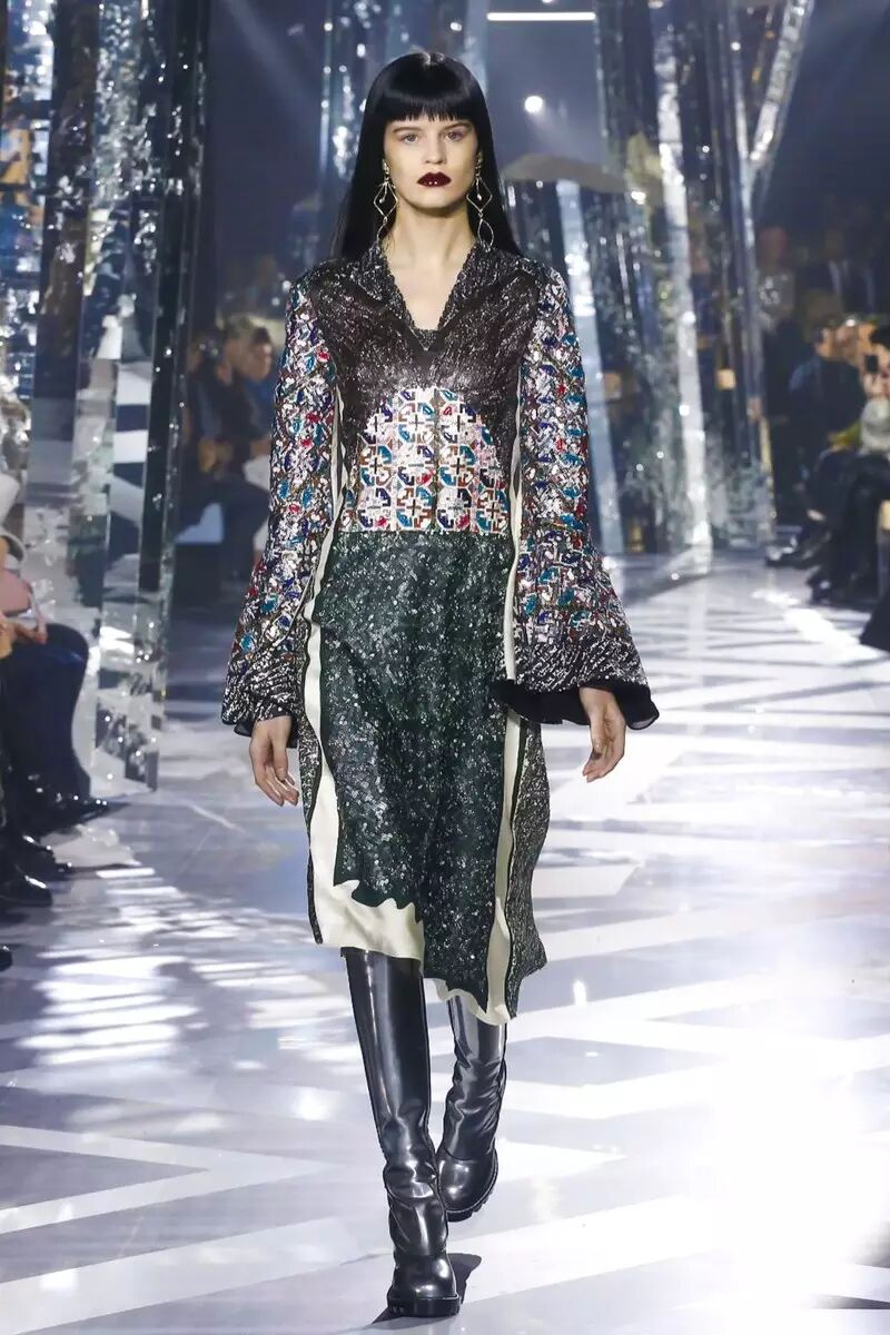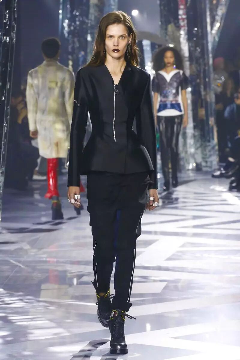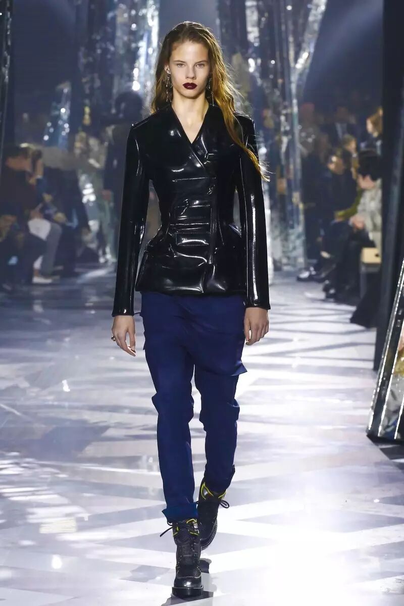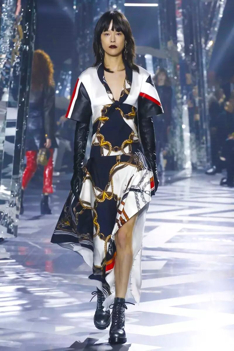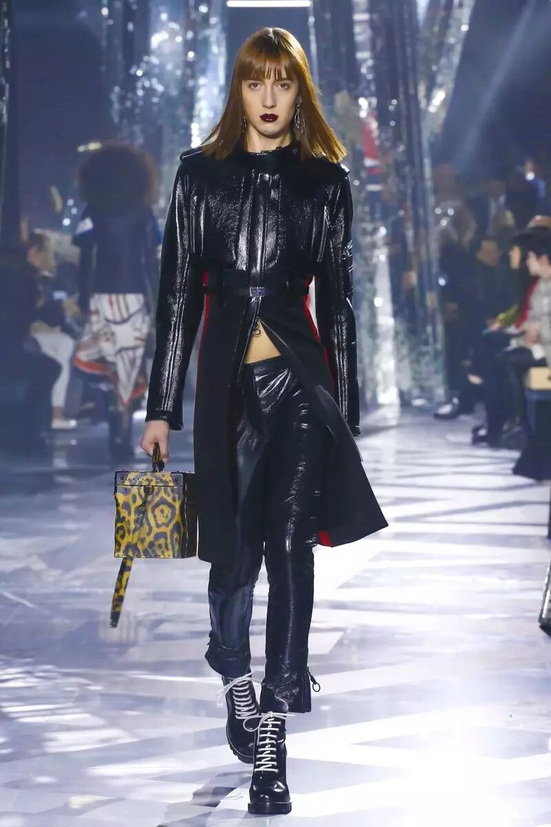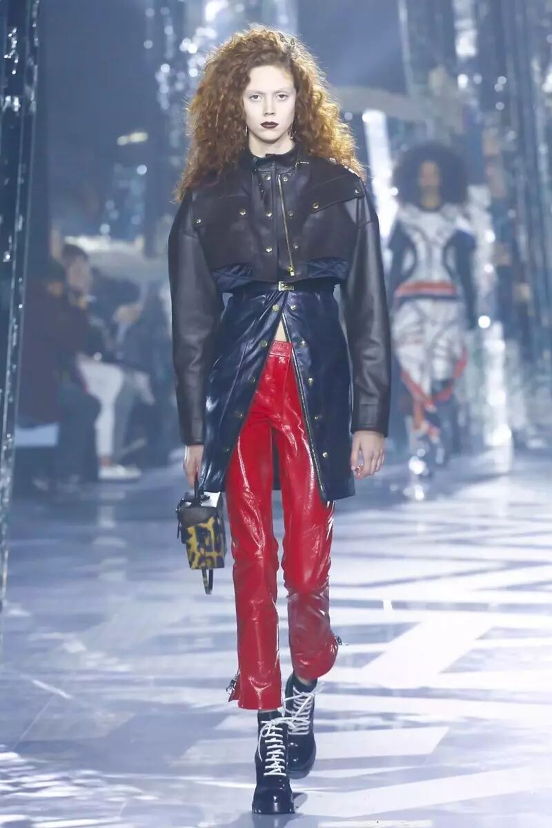 设计风格延续了经典的锁链印花,同时结合了现代与古典、线条与轮廓、运动与商务,改良式风衣夹克以及线条感极强的卫衣设计,实穿性都是极强的。在LOOK中我们看得到古老的部落元素和未来感的荧光色漆皮,这可能就暗示着这一季“未来考古学”的概念吧。