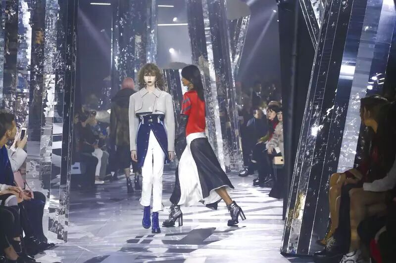 由57个跟制作Louis Vuitton硬箱相同材质的木材所制成的圆柱、200000块半破碎的镜子、80个工匠师共同制作那些圆柱、460米长的灯光缆线、35吨染色沙石,这一系设计师使用“未来考古学”概念在2016/2017秋冬系列秀场设计上。