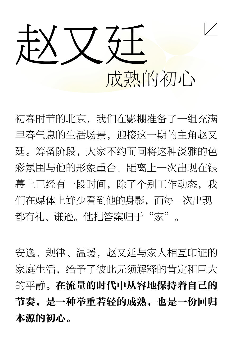 这段心路历程,他的妻子高圆圆也同样走过。两个人殊途同归地,以表演尽情宣泄着深藏内心的表达欲和创造欲,在生活中持续着恬淡自然的节奏以及对家庭和亲情的浓浓眷恋。因此,两人组成的家庭几乎不存在无谓的内耗,能够相互给予最大的安全感和认同感。“家对我来说是精神支柱”,赵又廷毫不掩饰,“只有顾好家我才能全力以赴地工作。”