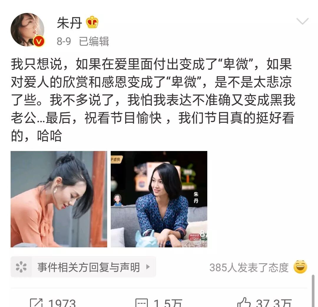 虽然事后朱丹在微博上回应:“如果在爱里面付出变成了卑微,如果对爱人的欣赏变成了卑微,是不是太悲凉了些。”