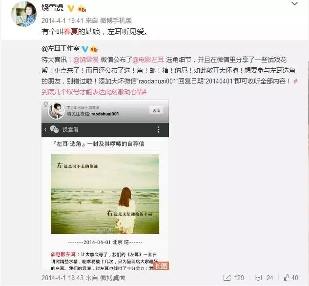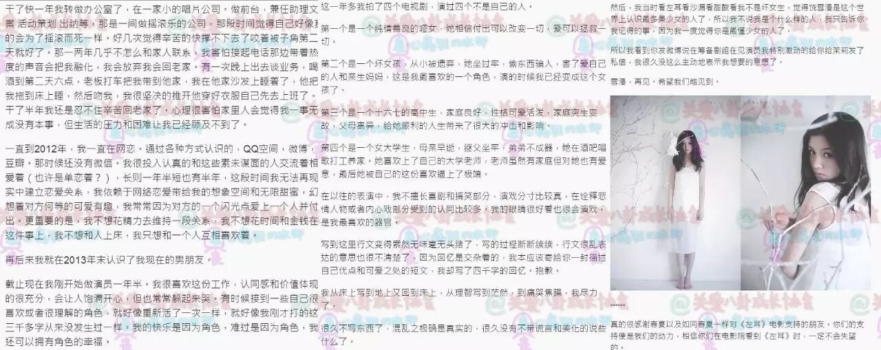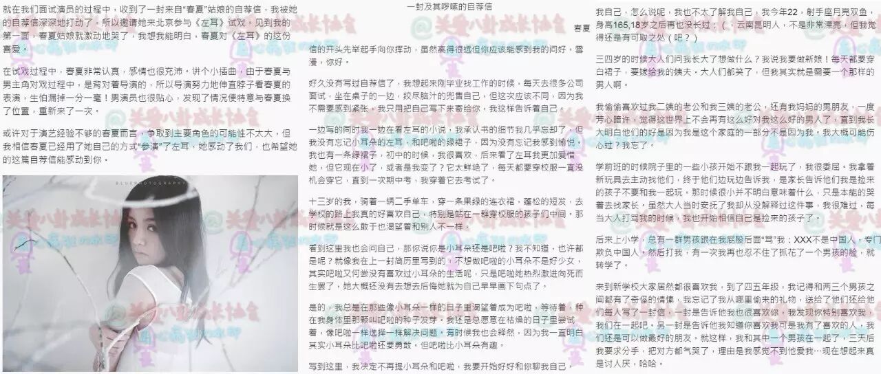 老公昨天看到你发了春夏的八卦:新科影后春夏的小八卦。我知道她,简单来说就是当时左耳试镜的时候,春夏写了这个自荐信,然后饶雪漫转发了,毕竟饶雪漫写的青春小说,对于春夏这种叛逆经历,还是嗯,春夏当时也转发了来着的,关注的早,有印象,一找还是有记录,不过现在都删掉了,进她主页是看不到了,最后没选上就是了,总而言之这姑娘眼睛挺会说话的,还是看作品吧,再发不出去我要生气了本宝宝也是有小情绪的。点开图片可拉伸看大图