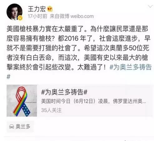 于是,就连平时不怎么介入社会事件的知名的美国华裔歌手王力宏,凌晨也几乎是在第一时间对这一惨案发表了评论,认为此案也体现了美国严重的枪支暴力问题,并认为50名死者的丧命,应该促使政府做出一些改变。