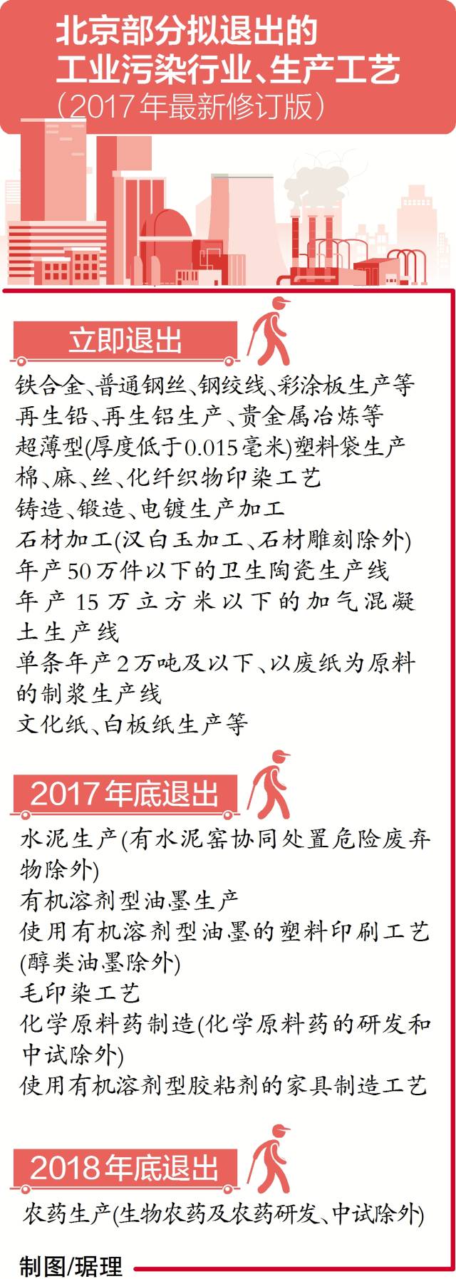 随着北京疏解非首都功能的进程加快,时隔三年后北京工业污染行业退出目录再出新版。记者获悉,由市经信委、市环保局联合编制的《北京市工业污染行业生产工艺调整退出及设备淘汰目录(2017年版)》已正式印发实施,涉及钢铁、有色金属、建材、化工、纺织印染、人造板及家具、医药、机械、印刷、造纸等11大类行业。相比2014年的版本,这份工业发展“负面清单”从155项增加到了172项。
