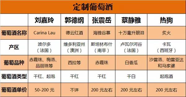 2015 年,刘嘉玲宣布与波尔多酒商合作推出个人品牌葡萄酒 “Carina Lau”,主要走亲民大众路线。郭德纲与澳洲维多利亚杜利德酒庄(Mt Duneed Estate)合作推出个人品牌葡萄酒 “德云红酒(DEYUN)”。张震岳、蔡健雅和热狗共同推出音乐人葡萄酒计划(MWP),分别定制推出 3 款葡萄酒:南非海雅谷慕南非特调干红葡萄酒、法国卢瓦尔河谷十万毫升眼泪干白葡萄酒和西班牙热狗炙火卡瓦气泡葡萄酒。