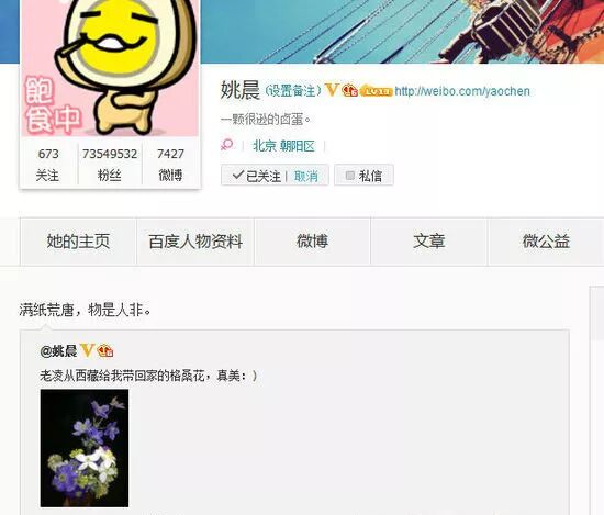 而姚晨一直保留原来的微博和那颗“卤蛋”头像