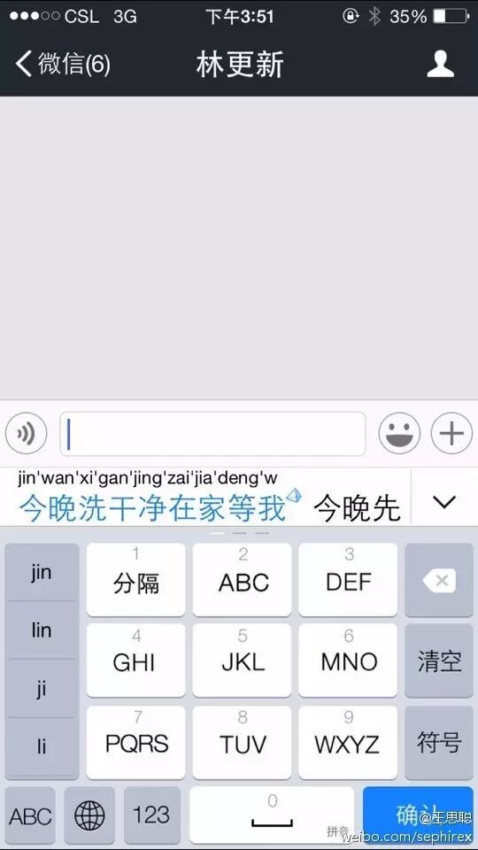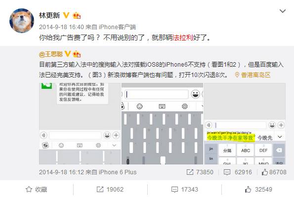 想当初你们思聪老公刚换了部新手机,就忍不住微博吐槽:目前第三方输入法中的搜狗输入法对搭载iOS8的iPhone6不支持(看图1和2),但是百度输入法已经完美支持。(图3)新浪微博客户端也有问题,打开10次闪退8次。当然这都不是重点,重点是他检测输入法用的正是同林更新的微信对话框,还编辑了一句极其露骨的邀约情话:今晚洗干净在家等我。