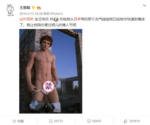 当然,关系好着好着就难免遭遇相爱相杀的窘境,15年林更新生日,王思聪就送出了一样叫所有人跌破钛合金眼镜的大礼——充气娃娃,还是个男版的!