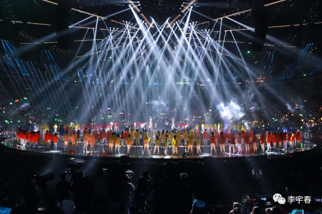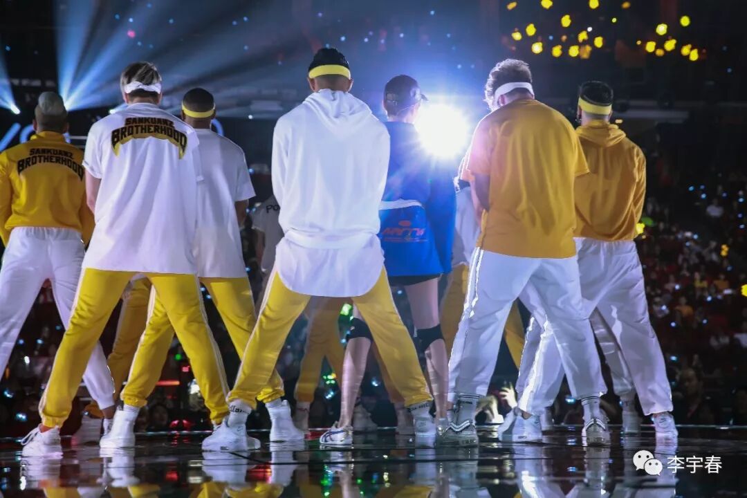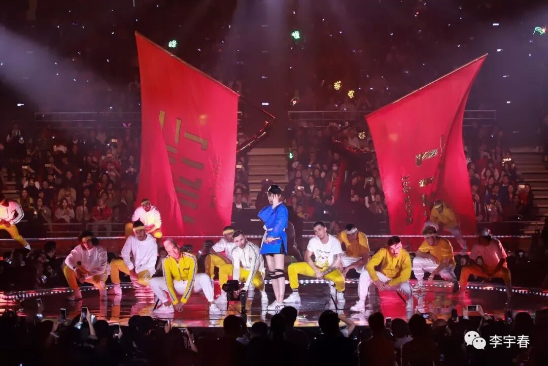 随后,舞台上的机械手臂开始挥动“流行”旗帜,强劲的力量搭配律动的节奏,气势澎湃。李宇春在旗帜前,带领舞者们热力舞蹈,走向舞台中央献唱《流行》。在歌曲电音融合嘻哈的曲风中,《流行》带领全场观众“高举双手,狂欢点赞...”