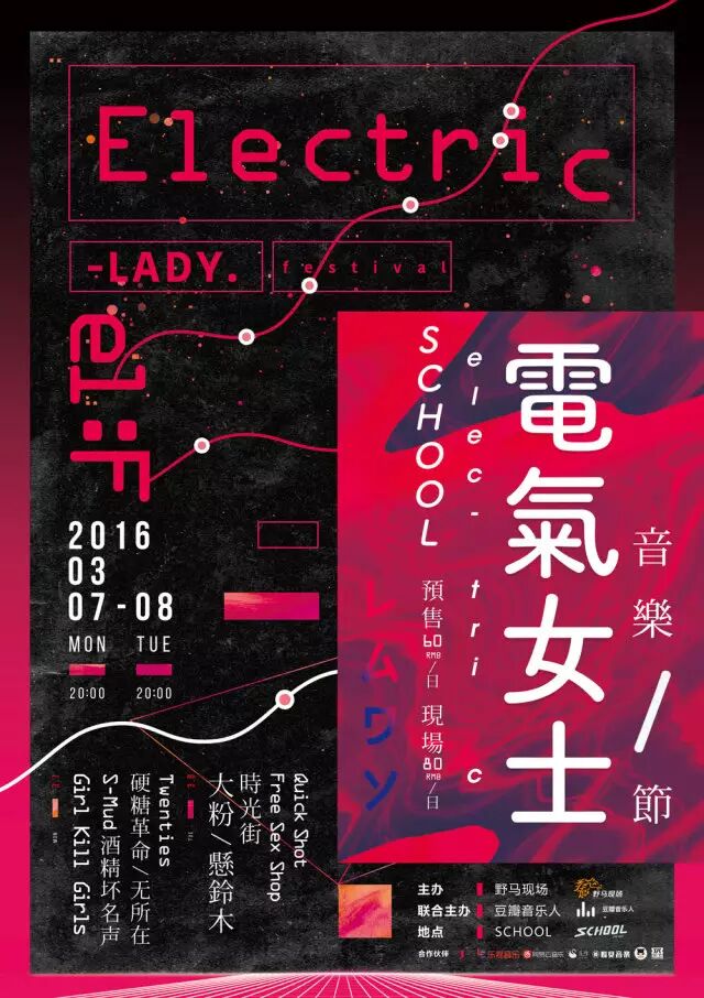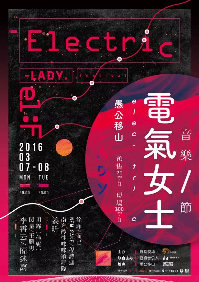 2016年3月7日、3月8日连续两天,野马现场YEMA Live联合豆瓣音乐人,将在愚公移山和School举办中国第一个纯粹的女性音乐节,名字就叫电气女士音乐节!
