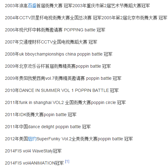 杨文昊获得过UK世界街舞大赛中国赛区popping冠军,是有史以来首位在美国取得popping冠军的华人,国内的街舞奖项也是拿奖拿到手软,是国内Wave,Animation风格的第一人,animation风格,是模仿70年代动画片慢帧的动作。