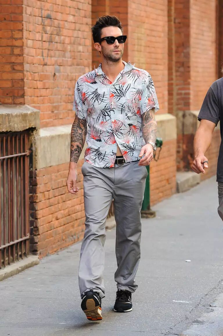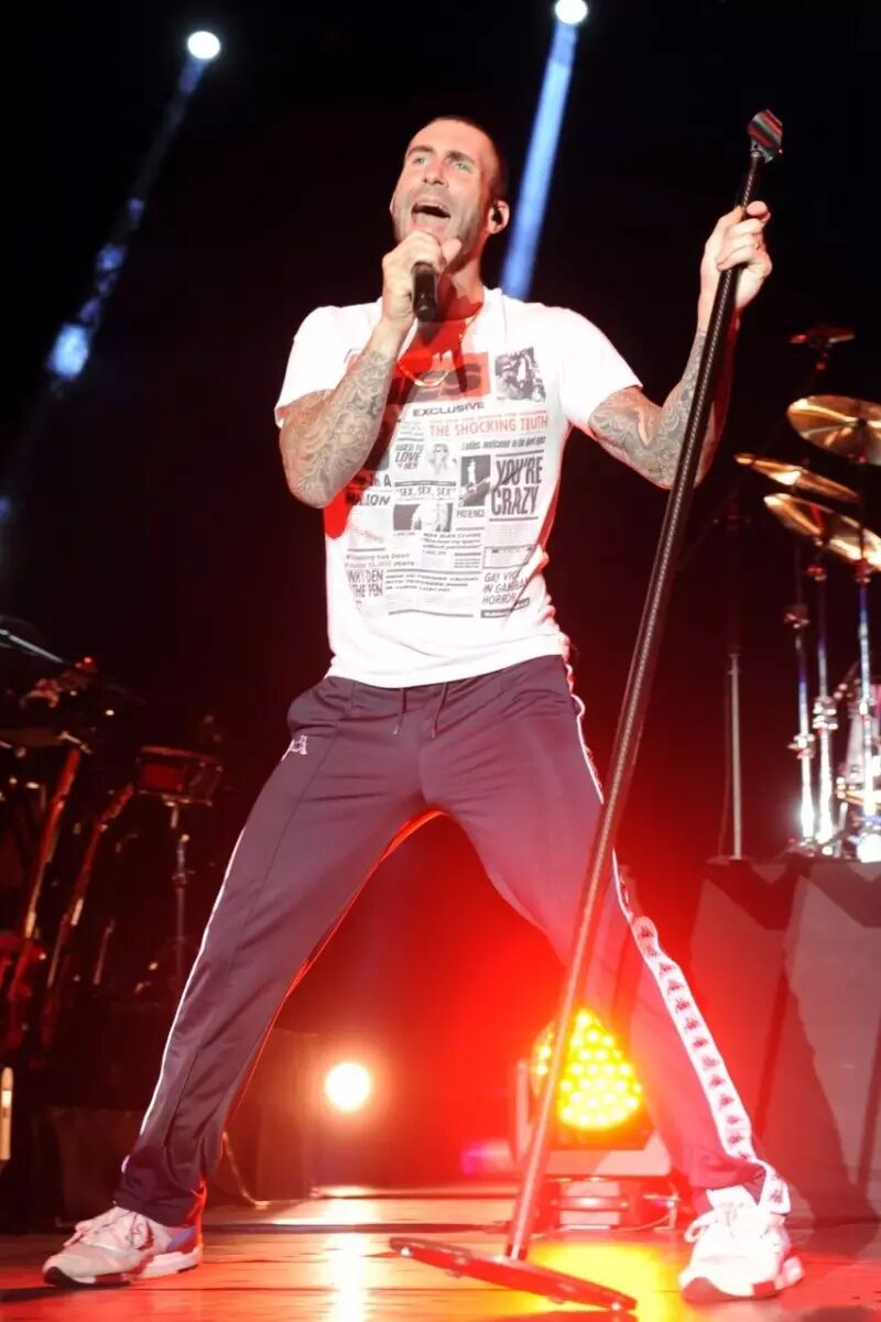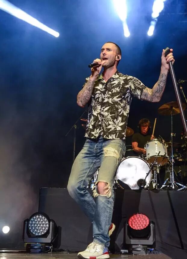这样的搭配基上没有什么问题,可怕的问题就在:.Adam 身上的刺青纹和衬衫上的花纹严重重叠,视觉产生混乱感。一开始以为Adam 是想顺应民情穿上花衬衫,结果发现...其实平常穿着简单的他,只有在演唱会时穿花衬衫!