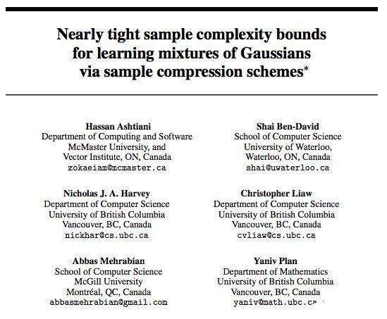 作者:Hassan Ashtiani、Shai Ben-David 等(麦克马斯特大学、滑铁卢大学等)链接:https://papers.nips.cc/paper/7601-nearly-tight-sample-complexity-bounds-for-learning-mixtures-of-gaussians-via-sample-compression-schemes.pdf