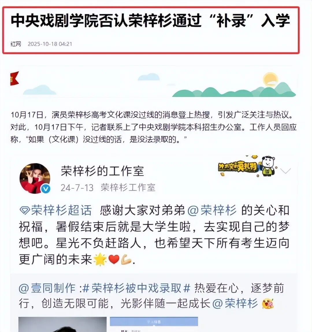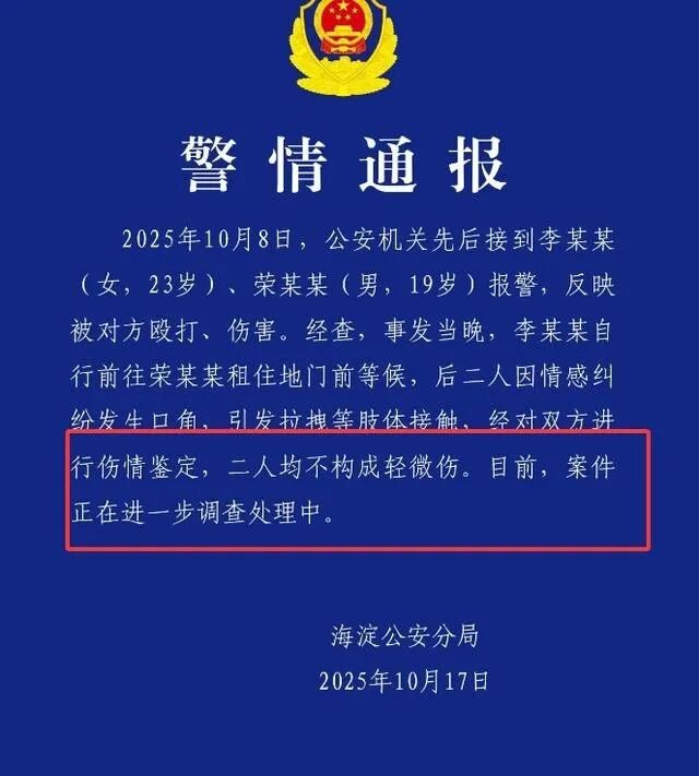 中戏作为荣梓杉就读的学校,很快就介入成立了特别工作组调查事件。 学校招生办还回应了网上关于荣梓杉文化课没过线靠补录进校的传闻,说录取一切符合要求,没违规操作。警方这边动作更快,10月17日北京海淀警方发布了通报,确认10月8日李禹熹和荣梓杉分别报警称遭对方伤害。 调查显示,当晚李禹熹去了荣梓杉租住地等待,导致争执,荣梓杉推她倒地,但伤情鉴定不构成轻伤。警方还调取了小区监控,核实了行程信息和证人陈述,案件还在进一步调查中。